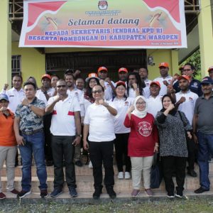 Waropen, (Papos) – Sekretaris Jenderal (Sekjen) Komisi Pemilihan Umum, Ir. Arif Rahman Hakim menunjungi KPU Kabupaten Waropen. Kedatangannya disambut dengan upacara adat,